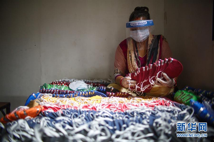 8月19日,尼泊尔加德满都一家口罩工厂的工人整理口罩。 新华社发(苏拉韦尔·什雷斯塔摄)