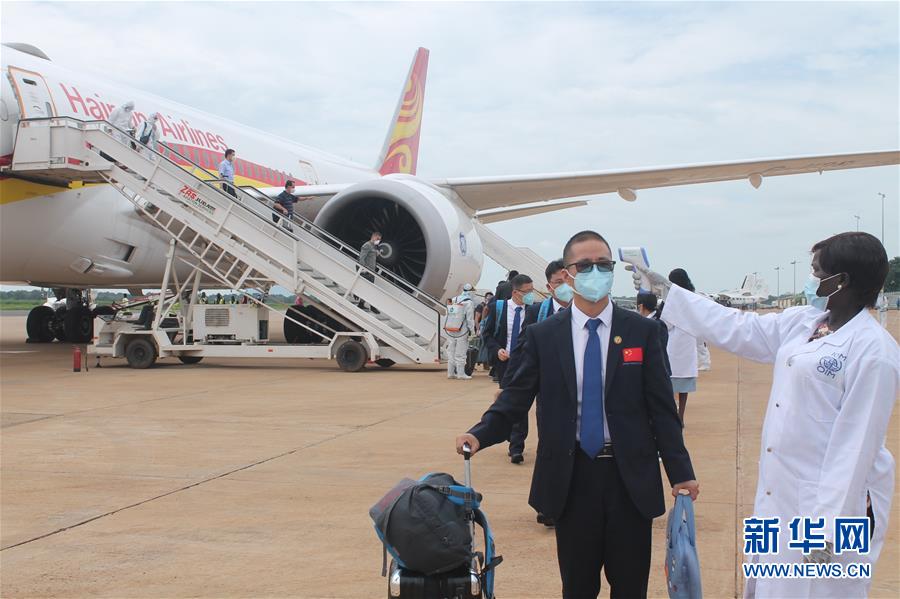 8月19日,在南苏丹首都朱巴,中国援南抗疫医疗专家组和医疗队成员进行体温检测。 新华社发(加莱·朱利叶斯 摄)