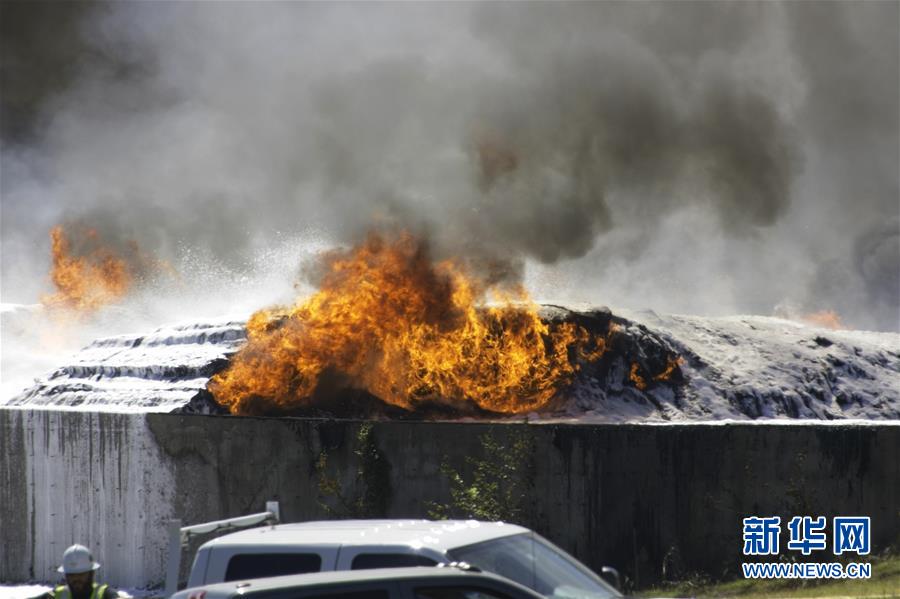 这是8月19日在美国得克萨斯州达拉斯市附近的大草原城拍摄的火灾现场。 美国得克萨斯州达拉斯市附近一家存放塑料制品的设施19日凌晨起火,大火目前仍在燃烧,但未造成人员伤亡。当地消防部门负责人说,大火由电线坠落引发,可能会持续数日。 新华社发(田丹 摄)