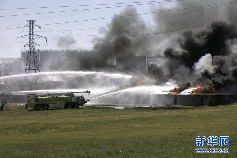 8月19日,在美国得克萨斯州达拉斯市附近的大草原城,消防人员在火灾现场灭火。 美国得克萨斯州达拉斯市附近一家存放塑料制品的设施19日凌晨起火,大火目前仍在燃烧,但未造成人员伤亡。当地消防部门负责人说,大火由电线坠落引发,可能会持续数日。 新华社发(田丹 摄)