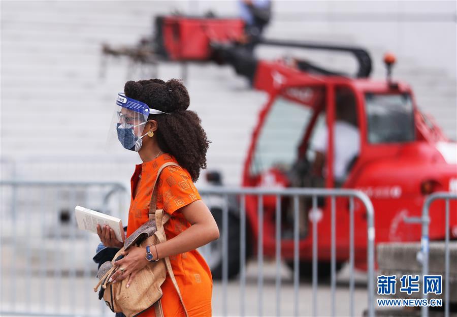 8月20日,在法国巴黎拉德芳斯商务区,一名女子走在上班路上。 为应对新冠疫情反弹,法国政府18日表示,计划在一些工作场所推广佩戴口罩。近期,法国新冠疫情出现反弹迹象。根据法国公共卫生局公布的数据,大约25%的聚集感染发生在工作场所,其中一半发生在屠宰场和农业企业。 新华社记者高静摄