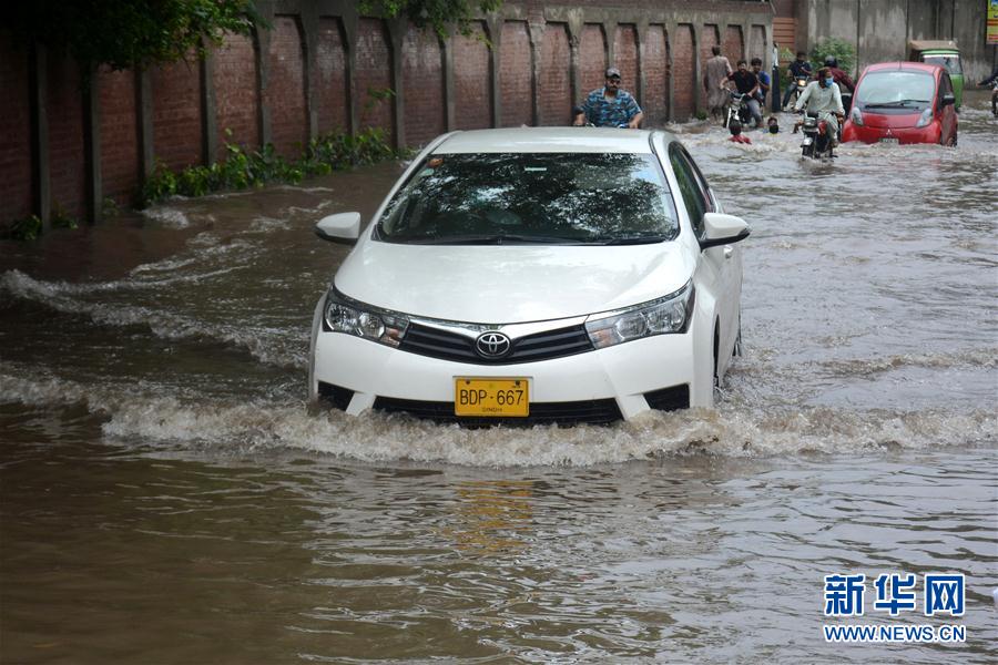 8月20日,在巴基斯坦旁遮普省首府拉合尔,车辆在洪水中前行。