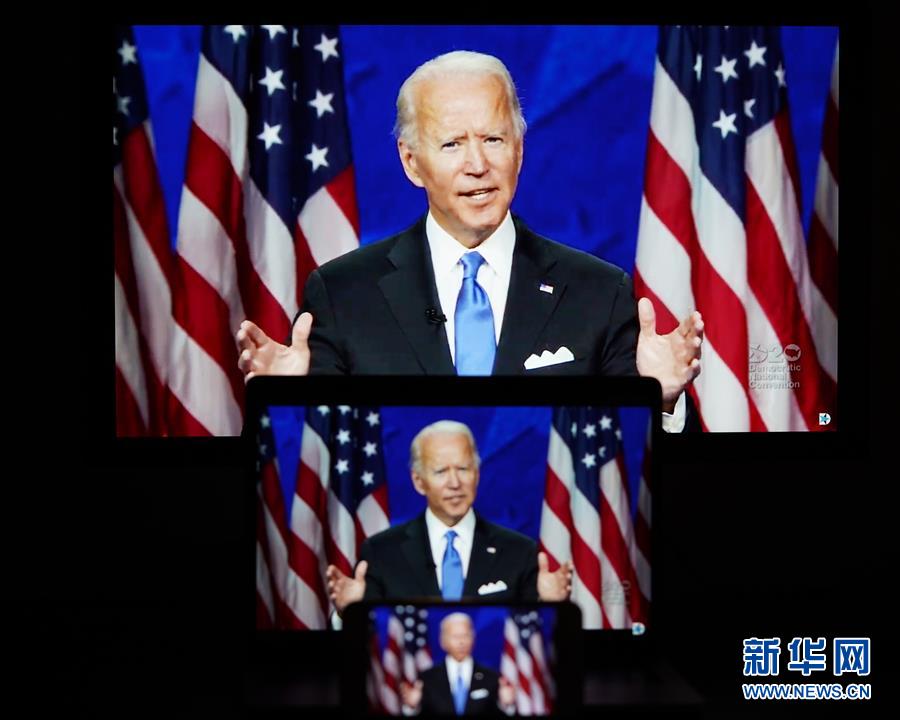 这张8月20日在美国阿灵顿拍摄的显示美国前副总统乔·拜登在线出席美国民主党全国代表大会的屏幕画面。 美国前副总统拜登20日晚在民主党全国代表大会上远程接受民主党总统候选人提名。 新华社记者 刘杰 摄