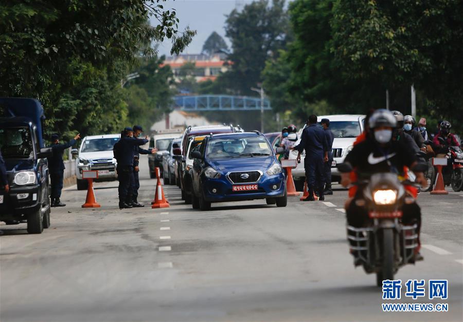 8月20日,在尼泊尔首都加德满都街头,车辆缓慢行驶接受检查。 近日,尼泊尔新冠疫情出现反弹,单日新增病例破千。尼泊尔政府采取多项措施加强疫情防控。 新华社发(苏拉韦·什雷斯塔摄)