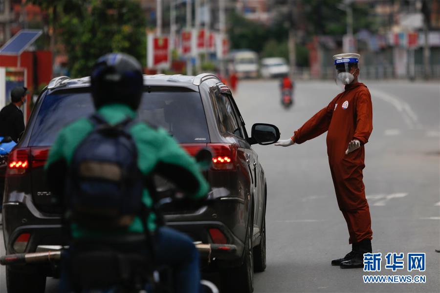 8月20日,在尼泊尔首都加德满都街头,警察检查行驶的车辆。 近日,尼泊尔新冠疫情出现反弹,单日新增病例破千。尼泊尔政府采取多项措施加强疫情防控。 新华社发(苏拉韦·什雷斯塔摄)