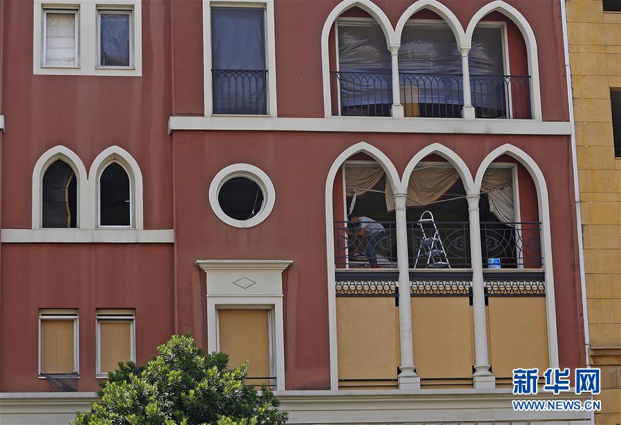 8月21日,在黎巴嫩首都贝鲁特,工人维修在爆炸中受损的建筑。 4日发生的贝鲁特港大爆炸已过去半个多月,重建家园的工作正在逐步展开。 新华社发(比拉尔·贾维希 摄)
