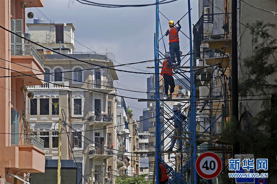 8月21日,在黎巴嫩首都贝鲁特,工人维修在爆炸中受损的建筑。 4日发生的贝鲁特港大爆炸已过去半个多月,重建家园的工作正在逐步展开。 新华社发(比拉尔·贾维希 摄)