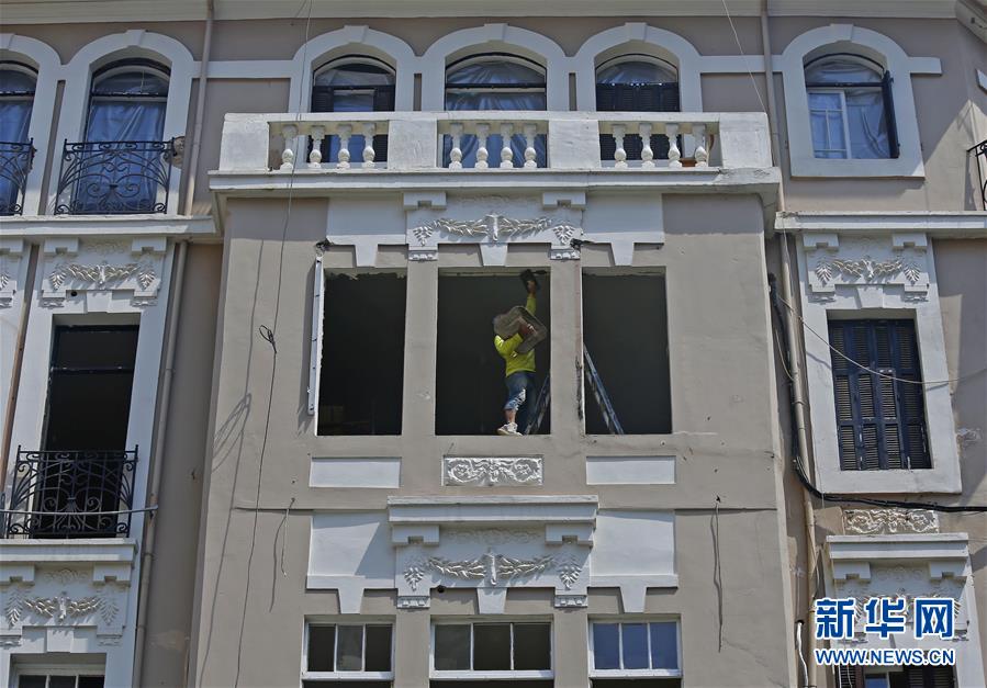 8月21日,在黎巴嫩首都贝鲁特,工人维修在爆炸中受损的建筑。 4日发生的贝鲁特港大爆炸已过去半个多月,重建家园的工作正在逐步展开。 新华社发(比拉尔·贾维希 摄)