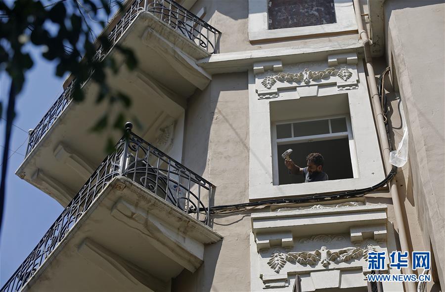 8月21日,在黎巴嫩首都贝鲁特,工人维修在爆炸中受损的建筑。 4日发生的贝鲁特港大爆炸已过去半个多月,重建家园的工作正在逐步展开。 新华社发(比拉尔·贾维希 摄)