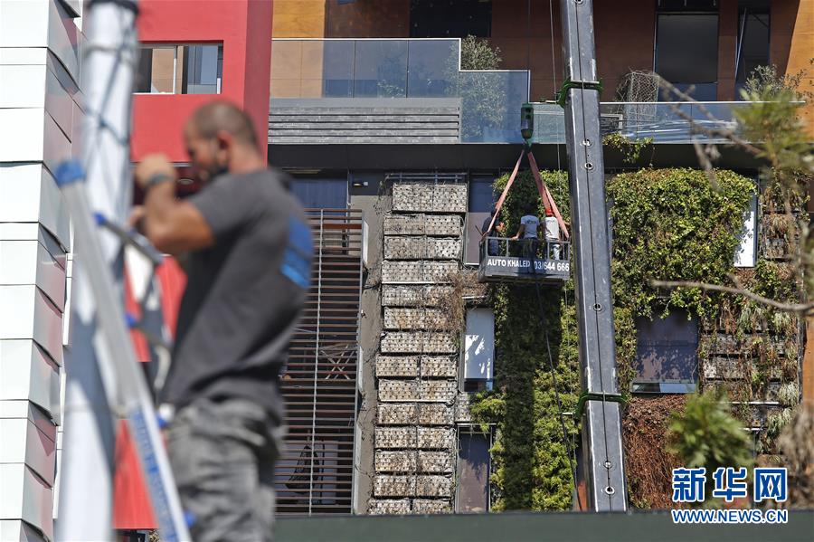 8月21日,在黎巴嫩首都贝鲁特,工人维修在爆炸中受损的建筑。 4日发生的贝鲁特港大爆炸已过去半个多月,重建家园的工作正在逐步展开。 新华社发(比拉尔·贾维希 摄)