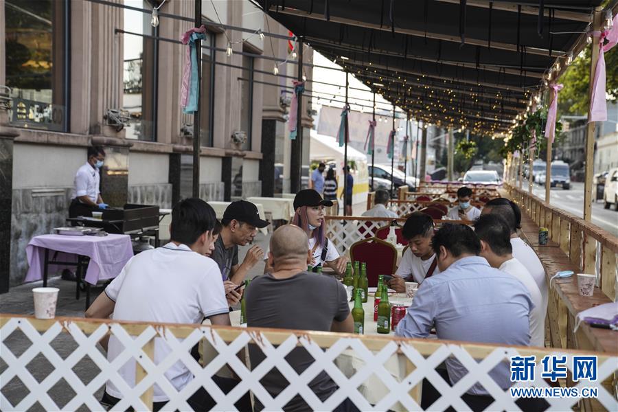 8月21日,顾客在美国纽约金皇廷酒楼户外就餐区用餐。