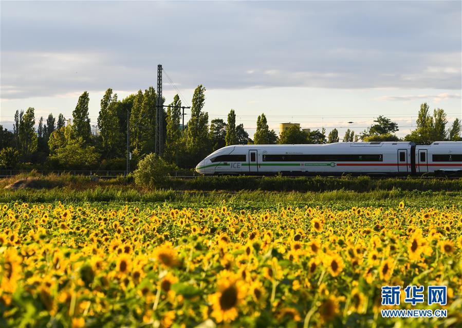 8月23日,列车驶过德国法兰克福市郊盛开的向日葵。 新华社记者逯阳摄