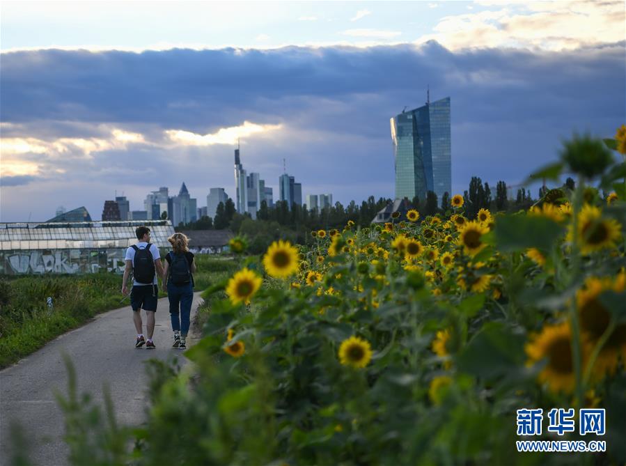 8月23日,在德国法兰克福,人们从市郊一处向日葵田旁经过。 新华社记者逯阳摄