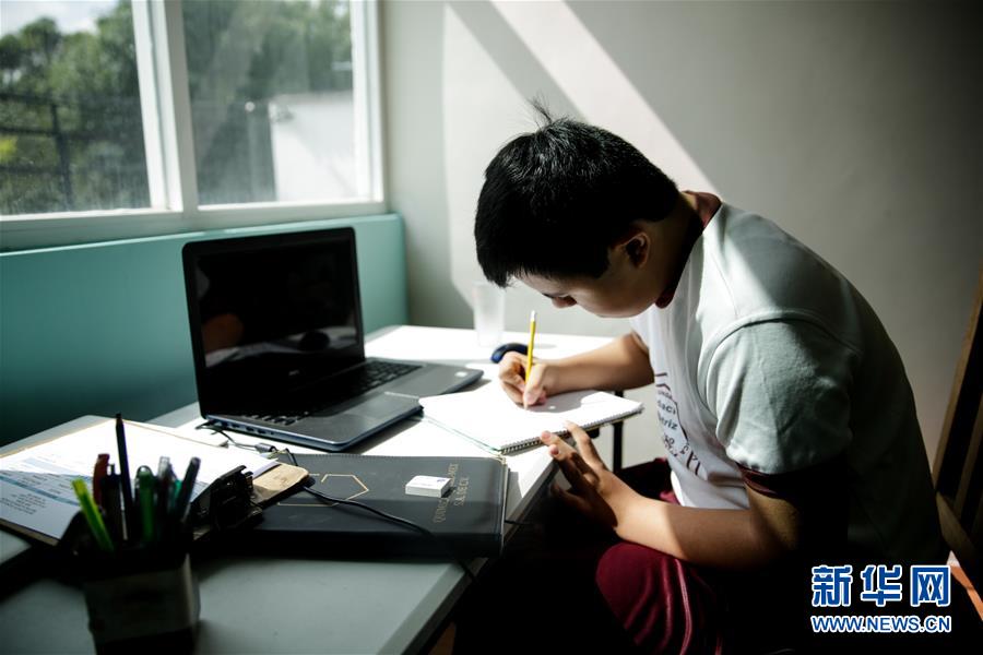8月24日,在墨西哥首都墨西哥城,16岁的奥斯卡·科尔德罗在电脑前记笔记。 墨西哥学校的2020-2021学年于当日开学,受疫情影响,目前课程基本以在线方式进行。 新华社发(弗兰西斯科·卡涅多 摄)