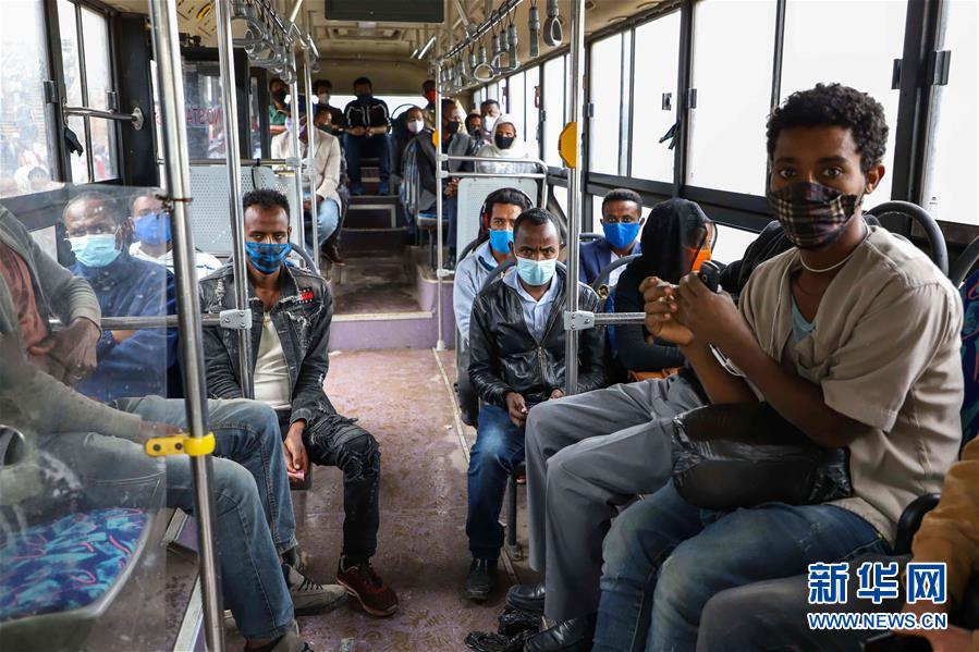 8月24日,在埃塞俄比亚首都亚的斯亚贝巴,乘客戴口罩乘坐公交车。 据埃塞俄比亚卫生部24日发布的数据显示,该国累计新冠确诊病例达42143例。 新华社发(迈克尔·特韦尔德摄)