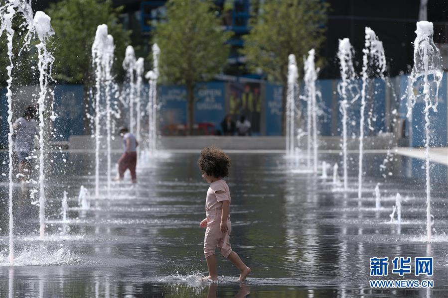 8月24日,儿童在英国伯明翰市中心的一处喷泉玩耍。 据当地媒体报道,近日,伯明翰的新冠确诊病例有所增加。 新华社发(乔恩·休珀摄)