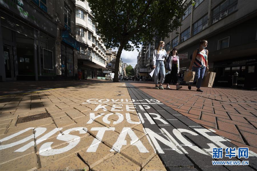8月24日,在英国伯明翰市中心,人们从一处“保持社交距离”标识旁走过。 据当地媒体报道,近日,伯明翰的新冠确诊病例有所增加。 新华社发(乔恩·休珀摄)
