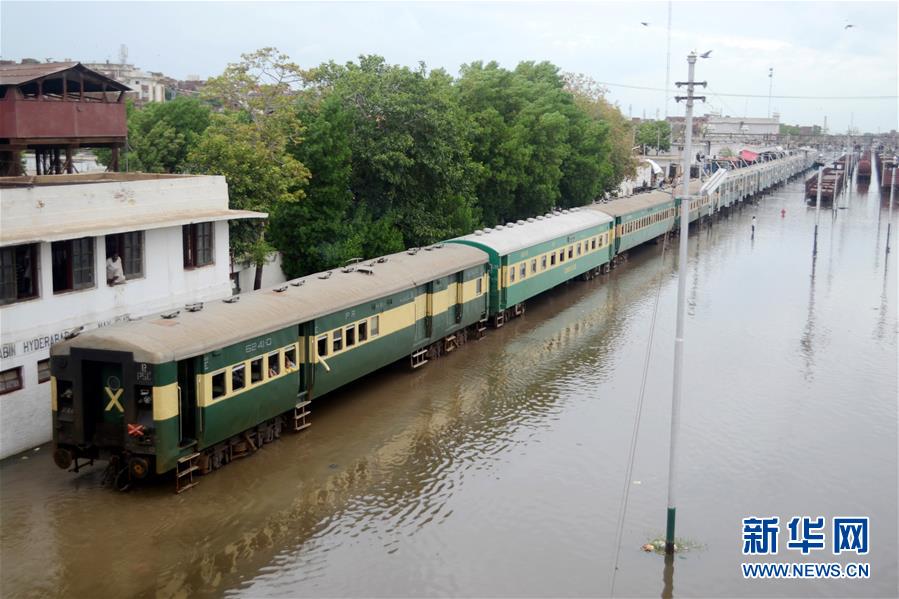 8月25日,在巴基斯坦海得拉巴,一列火车停在被洪水侵袭的火车站。 新华社发