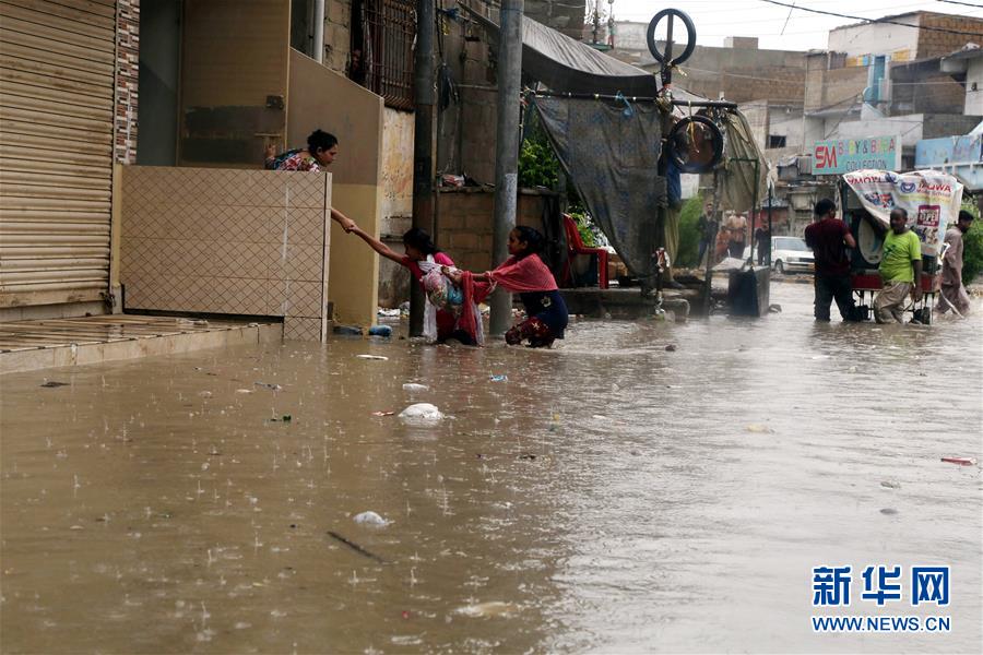 8月25日,在巴基斯坦卡拉奇,人们在洪水中行进。 新华社发