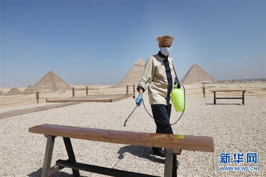 8月25日,一名工作人员在埃及吉萨金字塔附近喷洒消毒剂。 埃及旅游和文物部长阿纳尼8月24日发表声明说,自7月1日埃及恢复国际航班以来,胡尔加达、沙姆沙伊赫和马特鲁等旅游胜地已累计接待超过12万名外国游客。 新华社发(艾哈迈德·戈马摄)