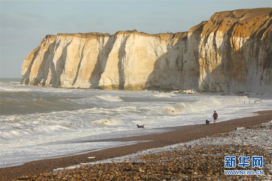 8月26日清晨,一名男子在英国纽黑文的海边遛狗。 近日,风暴“弗朗西斯”给英国多地带来强降雨和强风天气。 新华社发(蒂姆·爱尔兰摄)