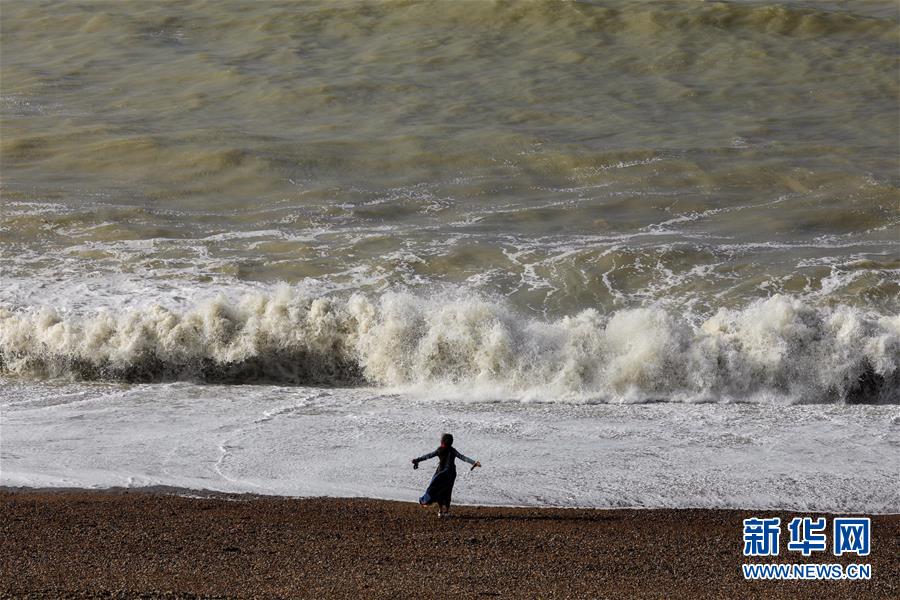 8月26日清晨,一名女子在英国纽黑文的海边观浪。 近日,风暴“弗朗西斯”给英国多地带来强降雨和强风天气。 新华社发(蒂姆·爱尔兰摄)