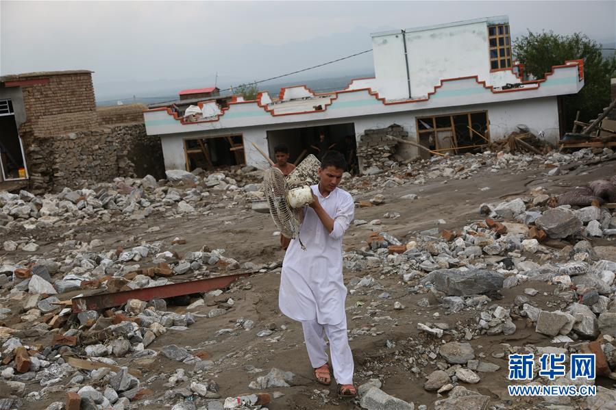8月26日,在阿富汗帕尔万省恰里卡尔,一名男子从一间受损的房屋内取走可用物品。 阿富汗政府官员26日说,阿东部25日突发的洪水已导致70人死亡,另有100多人受伤。 新华社发(拉赫马图拉·阿里扎达摄)