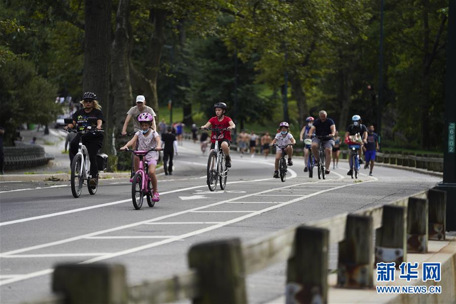 8月26日,人们在美国纽约中央公园骑自行车。 新华社记者 王迎 摄