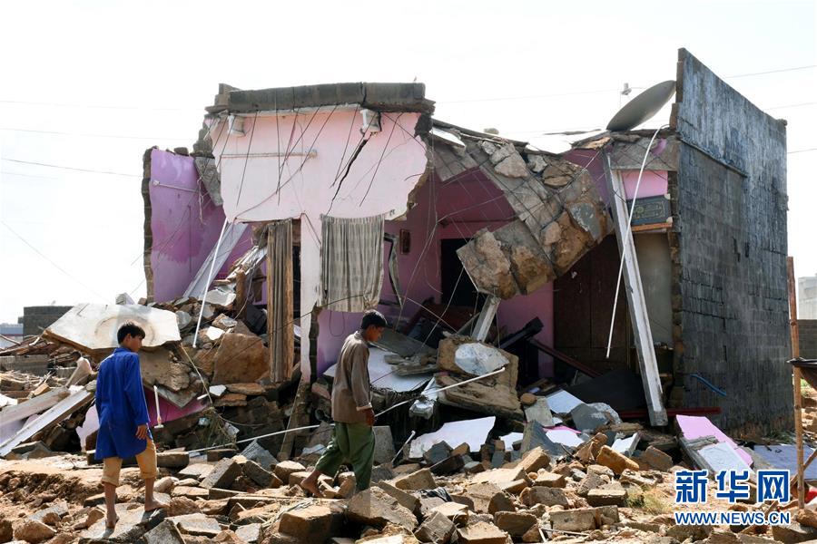 8月26日,在巴基斯坦卡拉奇,人们查看一栋在强降雨中严重受损的房屋。 连续降雨导致巴基斯坦多地发生洪灾。 新华社发