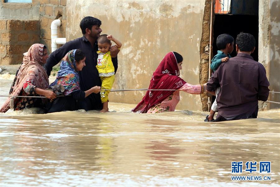 8月26日,人们在巴基斯坦卡拉奇涉水行走。 连续降雨导致巴基斯坦多地发生洪灾。 新华社发