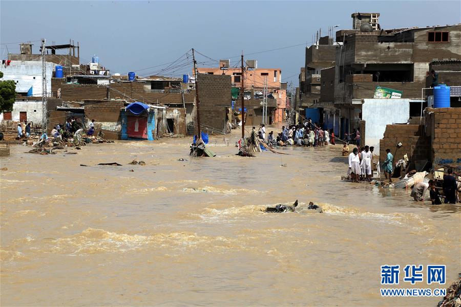 这是8月26日在巴基斯坦卡拉奇拍摄的一处遭洪水侵袭的居民区。 连续降雨导致巴基斯坦多地发生洪灾。 新华社发