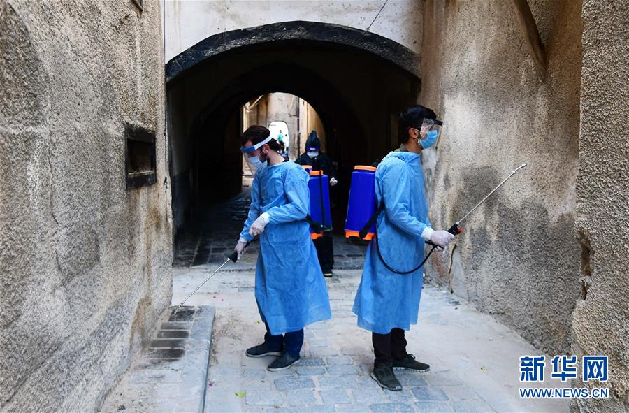 8月26日,志愿者在叙利亚首都大马士革进行消杀工作。 叙利亚卫生部26日称,该国累计新冠确诊病例2440例。 新华社发(阿马尔·萨法尔贾拉尼摄)