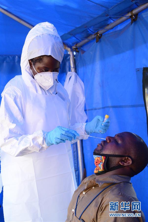 8月27日,医护人员在乌干达首都坎帕拉的一个卫生中心内为一名男子进行新冠病毒检测采样。 新华社发(尼古拉斯·卡乔巴摄)