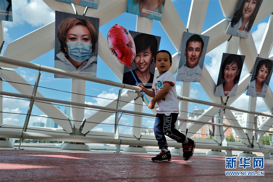 8月27日,在哈萨克斯坦首都努尔苏丹,一名儿童从以抗击新冠疫情为主题的摄影作品前走过。 新华社发(奥斯潘诺夫摄)