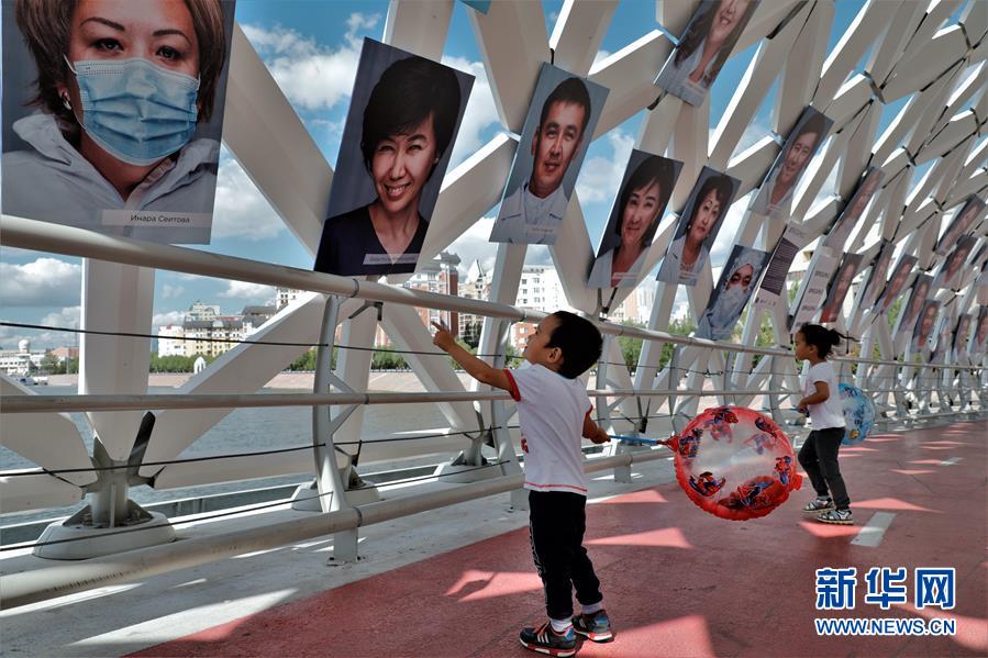 8月27日,两名儿童在哈萨克斯坦首都努尔苏丹观看以抗击新冠疫情为主题的摄影作品。 新华社发(奥斯潘诺夫摄)