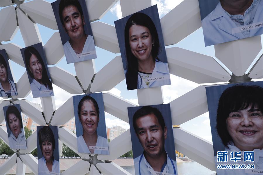 这是8月27日在哈萨克斯坦首都努尔苏丹举办的以抗击新冠疫情为主题的摄影展上展出的医护人员肖像。 新华社发(奥斯潘诺夫摄)