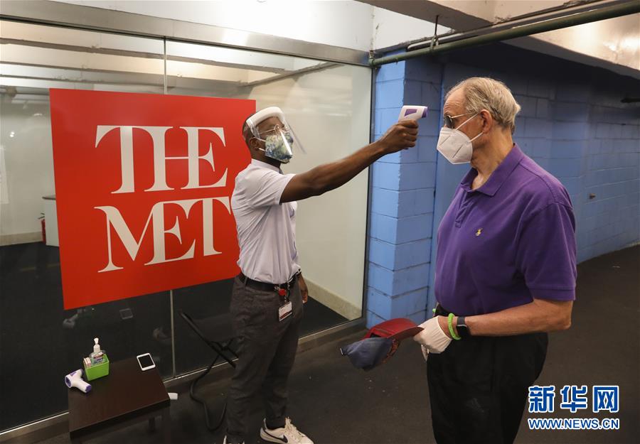 8月27日,在美国纽约大都会艺术博物馆第五大道主馆外,工作人员为参观者测量体温。 当日,受新冠疫情影响关闭5个多月的纽约大都会艺术博物馆第五大道主馆对会员重新开放,并将于29日起正式对公众开放。重新开放后,大都会艺术博物馆采取多项措施防控新冠病毒,包括限制参观人数、强制戴口罩、测量体温等。 新华社记者王迎摄