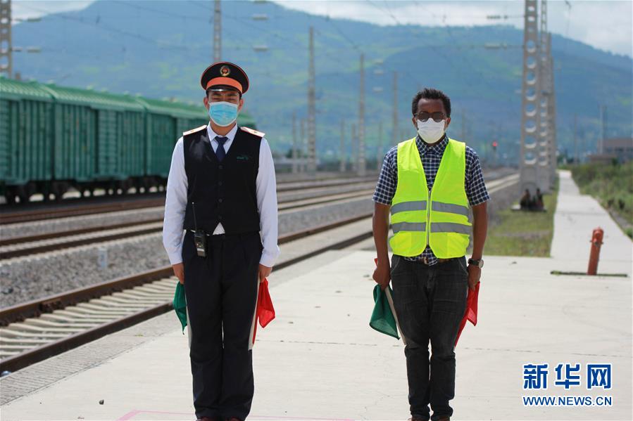 8月26日,在埃塞俄比亚首都亚的斯亚贝巴附近的亚吉铁路英多得车站,中方和埃塞员工共同执行接车作业。 新华社发(唐勇成摄)