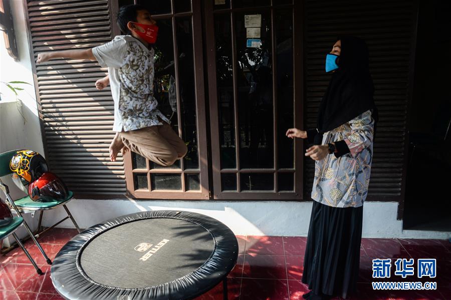 8月28日,在印度尼西亚南唐格朗的特别儿童康复中心,教师训练一名自闭儿童在蹦床上跳跃,以增强体能。 位于印度尼西亚南唐格朗的特别儿童康复中心是一家为自闭儿童提供教育和康复治疗的机构。在新冠疫情期间,该机构在采取防疫措施的前提下继续为自闭儿童治疗,培养他们的学习、交流等技能。 新华社发(阿贡摄)