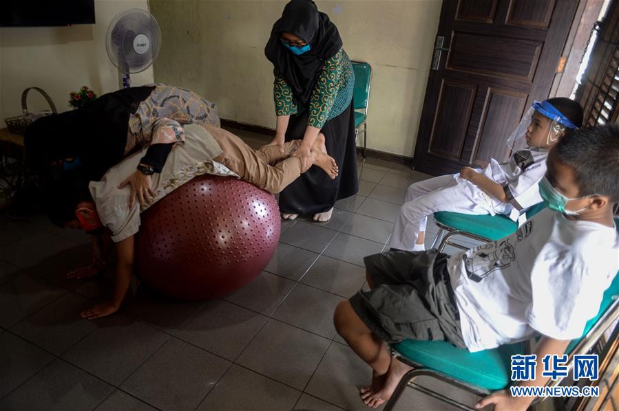 8月28日,在印度尼西亚南唐格朗的特别儿童康复中心,教师帮助自闭儿童进行身体康复训练。 位于印度尼西亚南唐格朗的特别儿童康复中心是一家为自闭儿童提供教育和康复治疗的机构。在新冠疫情期间,该机构在采取防疫措施的前提下继续为自闭儿童治疗,培养他们的学习、交流等技能。 新华社发(阿贡摄)