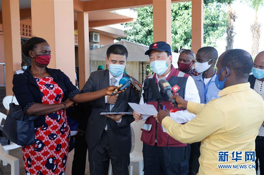 8月27日,在几内亚首都科纳克里,中国抗疫医疗专家组组长梁朝朝接受当地媒体采访。 应几内亚政府邀请,中国抗疫医疗专家组于27日乘包机抵达几内亚首都科纳克里,支持几方防控疫情。安徽省人民政府援几抗疫物资同机抵达。专家组在结束援助南苏丹抗疫工作后抵达几内亚首都,将进行为期10天的交流,通过考察走访、座谈研讨、培训指导、科普宣传等形式,分享中方抗疫经验。 新华社发(中国驻几内亚大使馆供图)