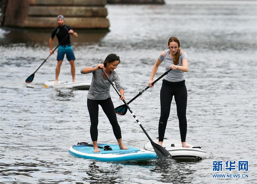 8月29日,站立式划水爱好者在德国法兰克福美因河上练习。 当天,在德国法兰克福市,不少站立式划水爱好者来到美因河上休闲娱乐度周末。 新华社记者 逯阳 摄