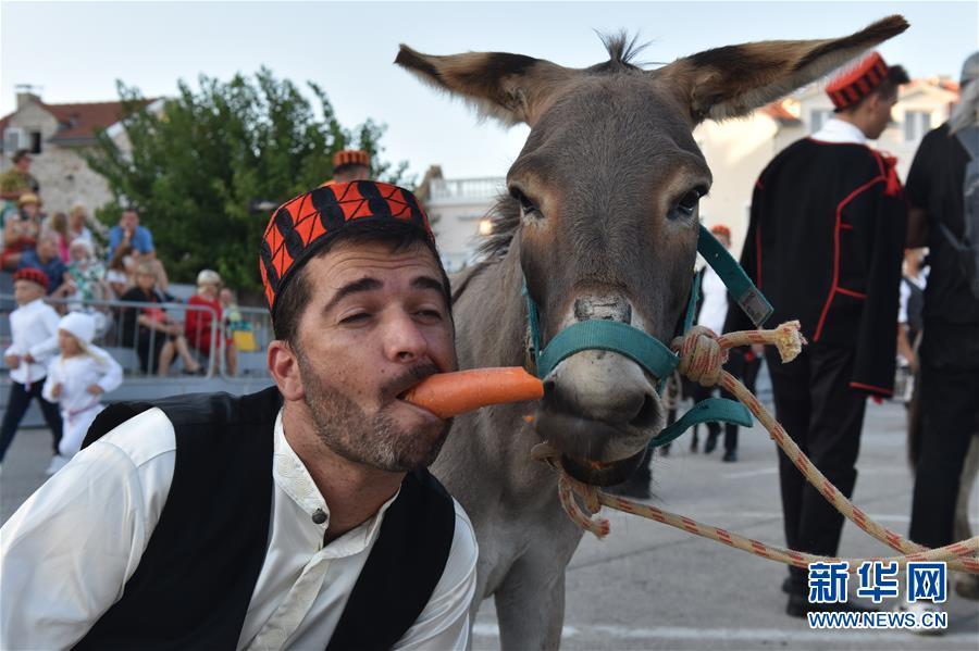 8月29日,在克罗地亚西南部沿海地区的特里布尼耶村,一名参加骑毛驴比赛的骑手与他的坐骑分享胡萝卜。 克罗地亚沿海的这个小村子有举办骑毛驴比赛的传统。这项赛事起源于上世纪50年代,每年都会吸引大批游客,今年的比赛受疫情影响从8月初推迟到了月底。 新华社发(耶拉维奇摄)
