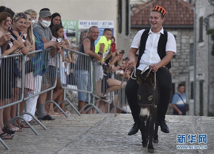 8月29日,在克罗地亚西南部沿海地区的特里布尼耶村,身着传统民族服装的骑手参加骑毛驴比赛。 克罗地亚沿海的这个小村子有举办骑毛驴比赛的传统。这项赛事起源于上世纪50年代,每年都会吸引大批游客,今年的比赛受疫情影响从8月初推迟到了月底。 新华社发(耶拉维奇摄)