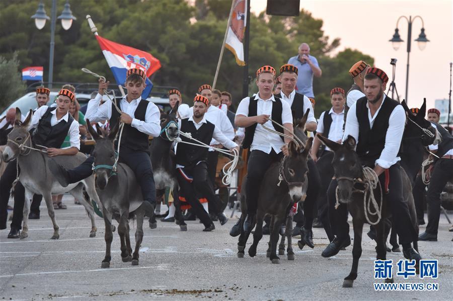 8月29日,在克罗地亚西南部沿海地区的特里布尼耶村,身着传统民族服装的骑手参加骑毛驴比赛。 克罗地亚沿海的这个小村子有举办骑毛驴比赛的传统。这项赛事起源于上世纪50年代,每年都会吸引大批游客,今年的比赛受疫情影响从8月初推迟到了月底。 新华社发(耶拉维奇摄)