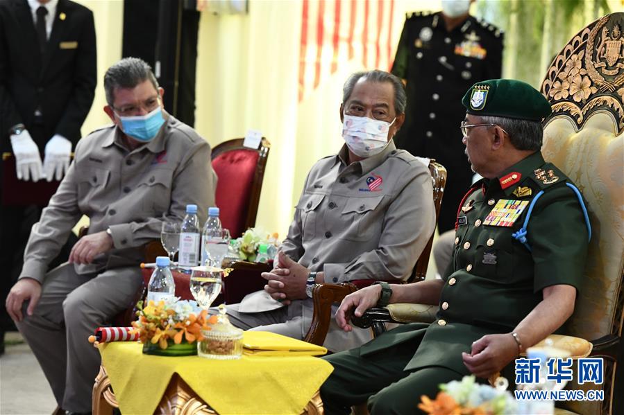 8月31日,在马来西亚普特拉贾亚,马来西亚最高元首阿卜杜拉(右)、总理穆希丁(中)参加马来西亚独立63周年庆典活动。 新华社发(马来西亚新闻局供图)