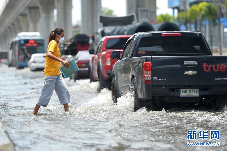 8月31日,泰国曼谷市民走过积水路段。 当日上午,短时暴雨天气导致泰国曼谷市出现内涝,部分道路严重积水。 新华社发(拉亨摄)