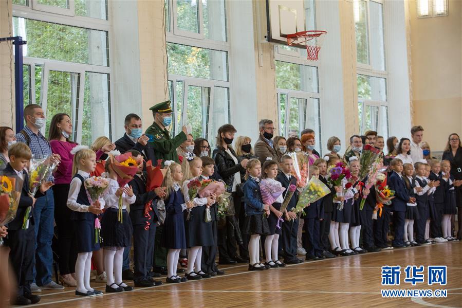 9月1日,在俄罗斯圣彼得堡,孩子们参加开学仪式。 俄罗斯累计新冠确诊病例1日突破100万例。随着新学年开始,俄政府对学校疫情防控做出了规定。 新华社发(莫京娜 摄)