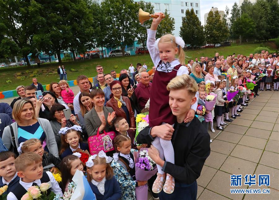 9月1日,在白俄罗斯首都明斯克,一年级小学生参加开学典礼。 当日,白俄罗斯迎来开学季。 新华社发(任科夫 摄)