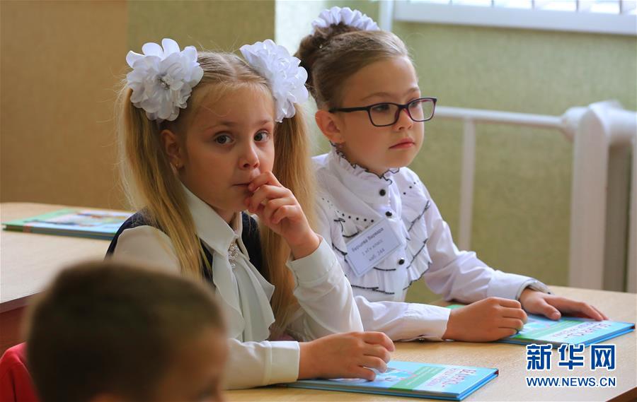 9月1日,在白俄罗斯首都明斯克,一年级小学生上第一堂课。 当日,白俄罗斯迎来开学季。 新华社发(任科夫 摄)